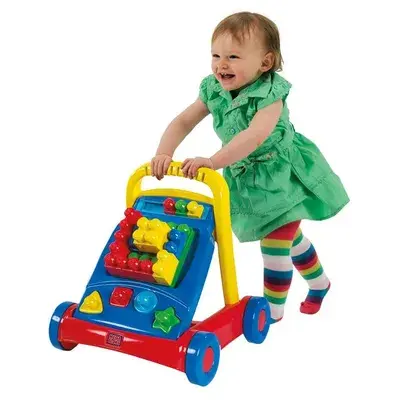 Игрушка имеет три конфигурации. Чтобы использовать игрушку в качестве ходунков, просто закрепите ручку вертикально под прямым углом к полу. Также вы можете с легкостью трансформировать каталку в конструктор для игры сидя. Малыш сможет возводить новые сооружения из кубиков, а также изучать цвета и формы с помощью сортера.