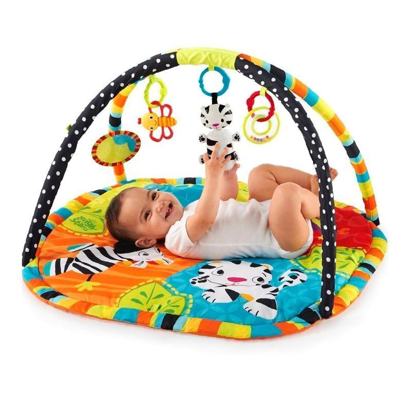 Коврик Bright Starts «Африка» с высококонтрастными элементами развивает слух, моторику, зрение и стимулирует любознательность ребенка. Разнообразные игрушки не дадут малышу заскучать: здесь есть безопасное зеркальце, погремушки в виде пчелки и зебры, прорезыватели для зубов, а также музыкальная игрушка-тигренок, которая воспроизводит звуки природы и приятные мелодии. Возьмите коврик напрокат, чтобы оценить все его преимущества.