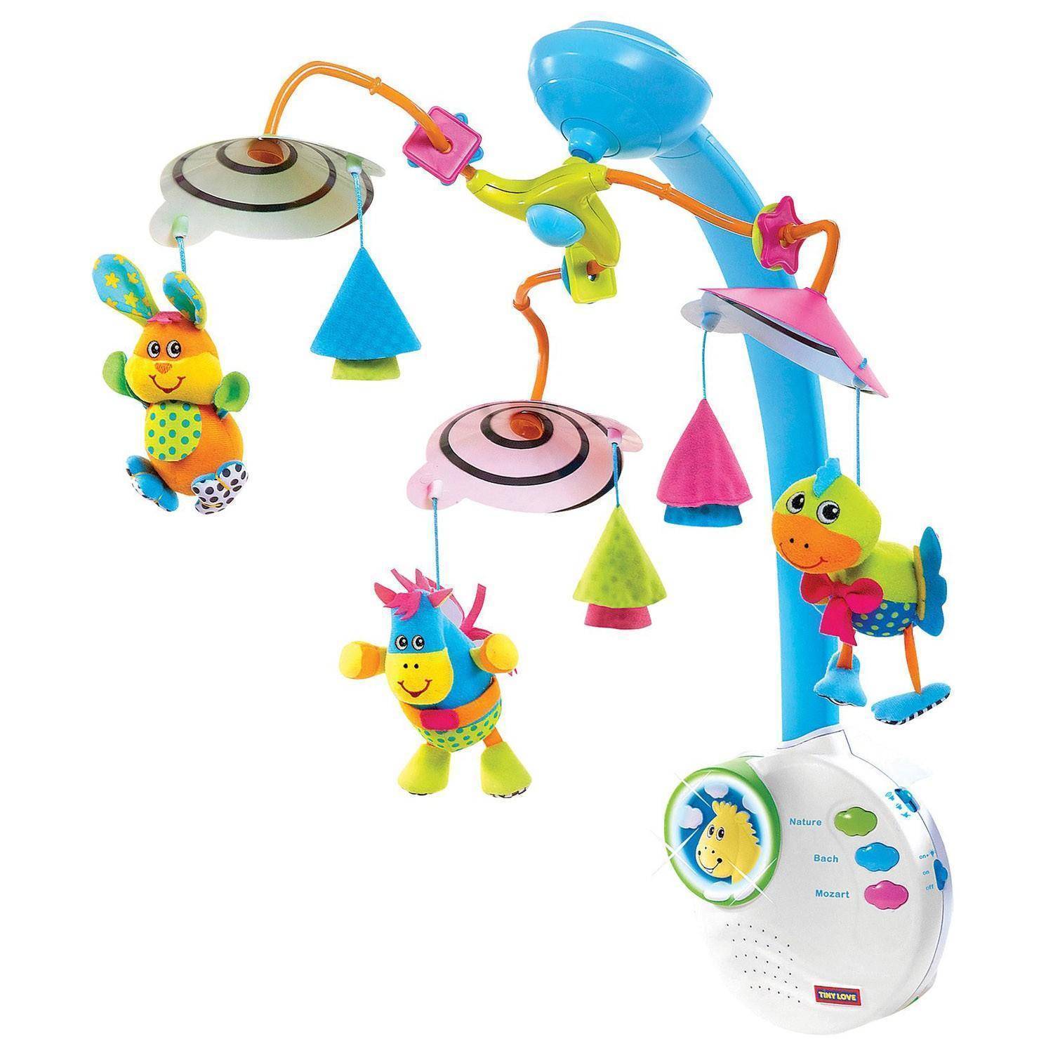 Музыкальный мобиль-ночник «Классический» от Tiny love - это зайка, птичка и лошадка, кружащиеся под классическую музыку - Баха, Моцарта, а также звучание природы. Над каждой игрушкой есть колпачок с нарисованной на нем черно-белой спиралькой. Малыш следит за вращающимися спиральками и зверьками, развивая тем самым свое зрительное восприятие.